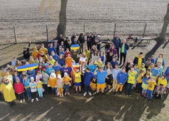 Dzieci naszej szkoły wraz z nauczycielami przystrojeni w barwy ukraińskiej flagi w ten właśnie sposób okazali gest solidarności z walczącą o wolność Ukrainą.