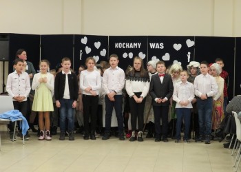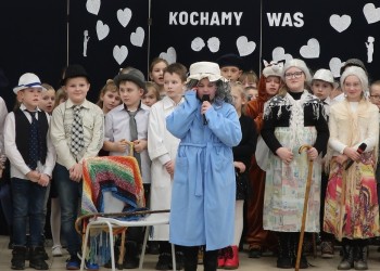 Po powitaniu zebranych gości przez p. J.Gallas, głos zabrała dyrektor szkoły J. Szlufarska –Kłosek, która stwierdziła, że 21 i 22 stycznia kojarzone są z szacunkiem, ciepłem, miłością i podziękowaniami. Podkreśliła jak ważną rolę spełniają dziadkowie w wychowaniu i życiu wnuków. Następnie złożyła wszystkim dziadkom serdeczne życzenia i zaprosiła na występy artystyczne. Na twarzach dzieci z klas I-IV było widać ogromną radość oraz skupienie. Zaprezentowały swoje umiejętności recytatorskie i wokalne, a klasa III wystawiła przedstawienie pt. ”Czerwony Kapturek – wersja współczesna”. Gościom towarzyszyły radość i uśmiech na twarzach, a u niektórych również łzy wzruszenia. Swoimi popisami dzieci zaskarbiły sobie serca zacnych gości, którzy w podzięce nie szczędzili gorących braw. Wnuczęta w ten sposób odwdzięczyły się babciom i dziadkom za ich miłość, rozpieszczanie, codzienny trud w wychowaniu oraz troskę i ciepło domowego ogniska. Na zakończenie wręczyły własnoręcznie wykonane prezenty dla swoich ukochanych Babć i Dziadków i zaprosiły na przygotowany z tej okazji słodki poczęstunek.
