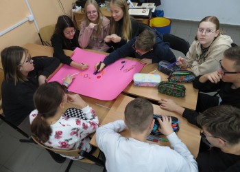 Mogli zobaczyć też na zdjęciach, jak wyglądają włosy i skóra głowy z różnymi dolegliwościami. Podczas warsztatów uczniowie stworzyli plakaty, które miały pomóc im w zapamiętaniu informacji, jak powinien wyglądać zdrowy posiłek, aby cały organizm był dobrze odżywiony.