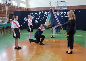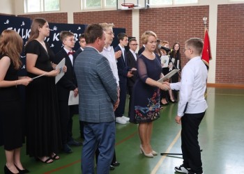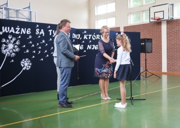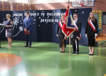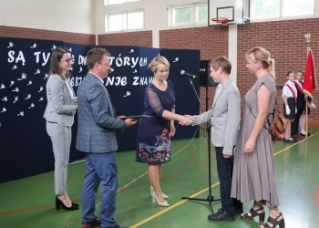 Następnie miało miejsce wyjątkowo podniosłe wydarzenie - przekazanie sztandaru. Później dyrektor szkoły wręczyła wzorowym uczniom świadectw z wyróżnieniem, a rodzicom listy gratulacyjne. Głos zabrał przedstawiciel organu prowadzącego szkołę – pan Łukasz Malczewski, sekretarz gminy, który podziękował za współpracę i życzył wszystkim udanych wakacji. Podobnie jak w latach ubiegłych wręczono też medal „Herkulasa”, czyli ucznia, który zrobił największy progres w swoim zachowaniu i/lub edukacji. W tym roku tytuł Herkulesa przypadł w klasach – 1-3 – Aurelii Zbrzeźnej, a w klasach 4-8 – Julii Olejniczak.