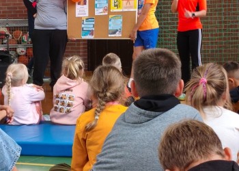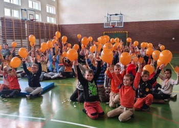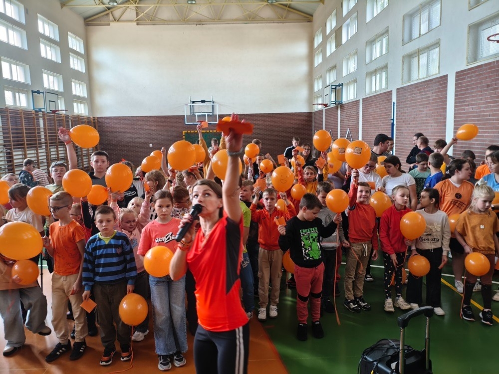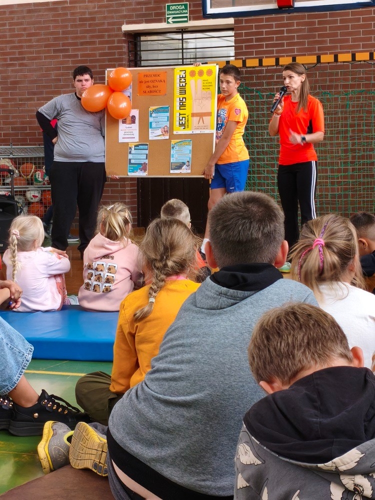 Na holu szkoły przygotowano gazetkę tematyczną z plakatami i hasłami antyprzemocowymi, wykorzystując gotowe materiały MEN. Była to ważna forma wizualnej kampanii edukacyjnej, która przyciągała uwagę uczniów i pracowników szkoły. W czwartek zorganizowano Dzień Pomarańczowy – symboliczny gest solidarności z ofiarami przemocy. Uczniowie i nauczyciele przyszli tego dnia ubrani na pomarańczowo. Odbył się również mini happening, podczas którego uczniowie otrzymali pomarańczowe sznurowadła z Fundacji Dajemy Dzieciom Siłę "Sieciaki – Jest Nas Więcej" oraz balony, co dodatkowo uatrakcyjniło wydarzenie i podkreśliło jego symbolikę. Całość wydarzenia zakończył wspólny okrzyk "STOP PRZEMOCY", wyrażający sprzeciw wobec wszelkich form agresji i nienawiści.